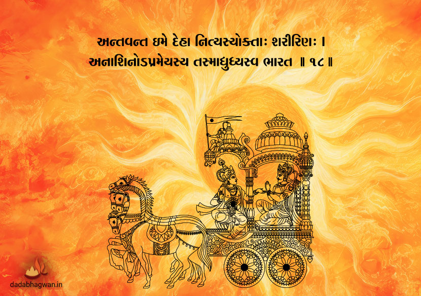 પરમ પૂજ્ય દાદાશ્રી તેનો અર્થ સમજાવતા કહે છે કે, “આત્મા નિત્ય છે, અવિનાશી છે, અપ્રમેય છે. એવા શરીરધારી આત્માના આ શરીરો તે બધાં નાશવંત કહ્યાં માટે, હે ભરત, તું યુદ્ધ કર.”