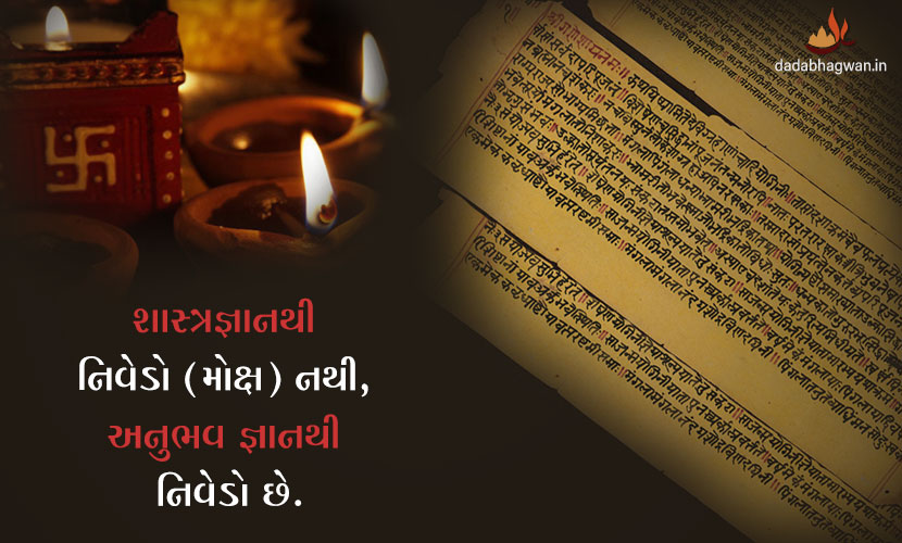 શાસ્ત્રજ્ઞાનથી નિવેડો (મોક્ષ) નથી, અનુભવ જ્ઞાનથી નિવેડો છે. અનુભવ જ્ઞાન અનુભવી જ્ઞાની પાસેથી જ મળે. શાસ્ત્રો આપણી ભૂલ ના દેખાડે. એ સામાન્ય ભાવે બધાને કહી જાય. પ્રત્યક્ષ વિના ઉપાય નથી. કાગળ પર દોરેલો દીવો અંધારામાં પ્રકાશ આપે? શાસ્ત્રોની સીમા કાગળ પરના દીવા જેટલી જ છે. સાક્ષાત્ પ્રકાશ ફક્ત એક જ્ઞાની જ આપી શકે છે, જે સ્વયં પૂર્ણ પ્રકાશક છે.